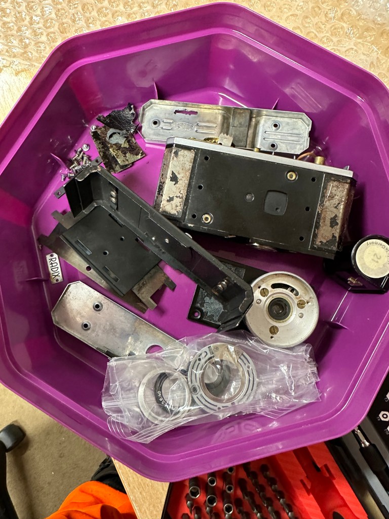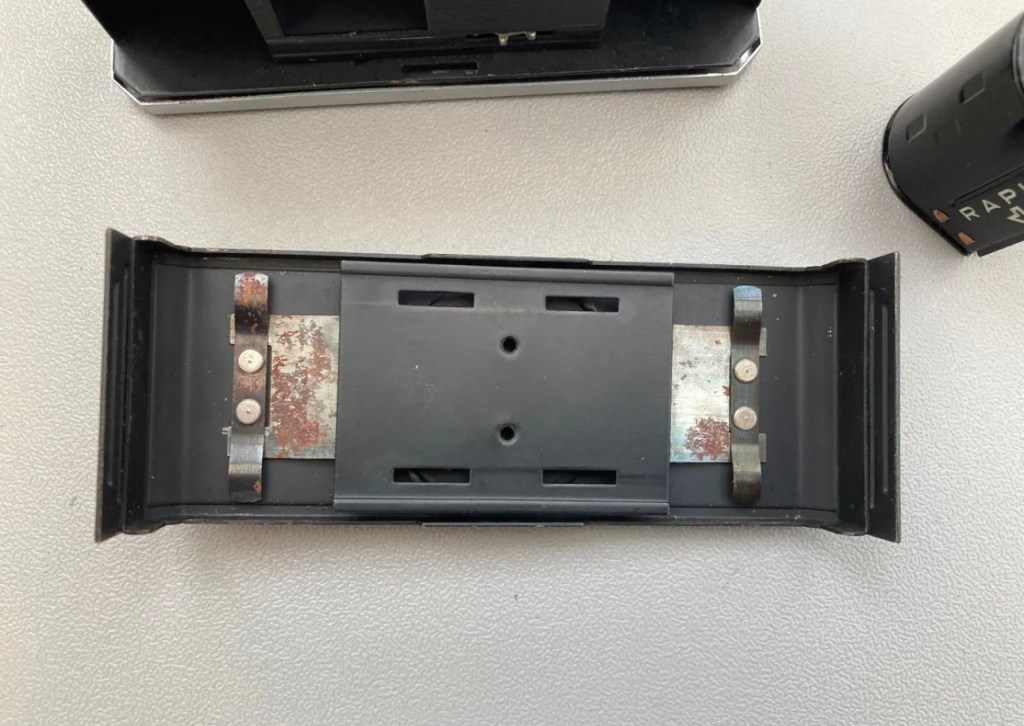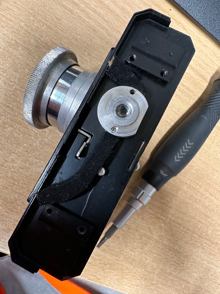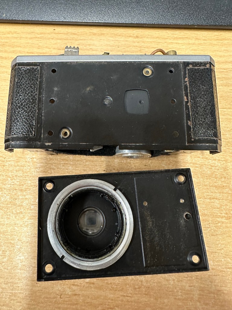 There is rust on the backplate, and this will need removing, I’m planning on sanding this down priming and repainting and a new skin will be put on the body. There are only 4 small pieces on this camera so this shouldn’t be an issue. Some lubrication, spotting and a good Polish will then hopefully complete this refurbishment.