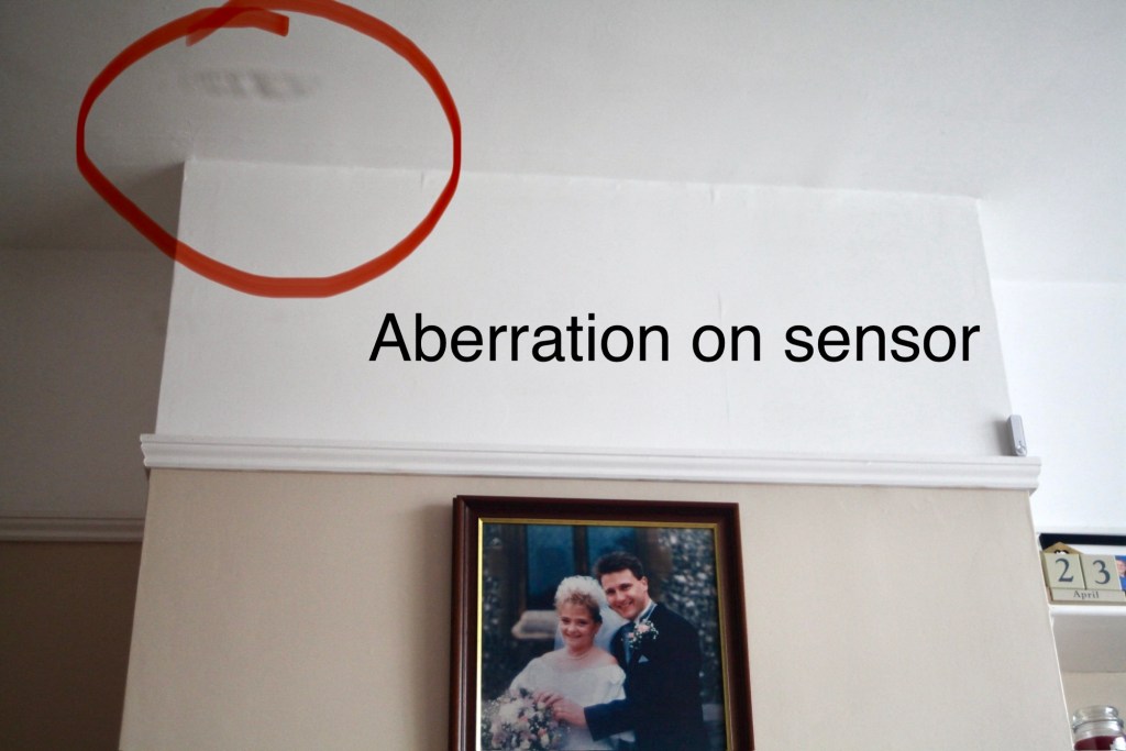 Whilst taking a random photo looking at our ceiling, I became aware of what looked like a water leak by the chimney stack. This gave me some concern but I needn’t have been worried as it appears in other photos and is more than likely an Abberation mark on the sensor. The two pictures below show that mark on the sensor in the same area.