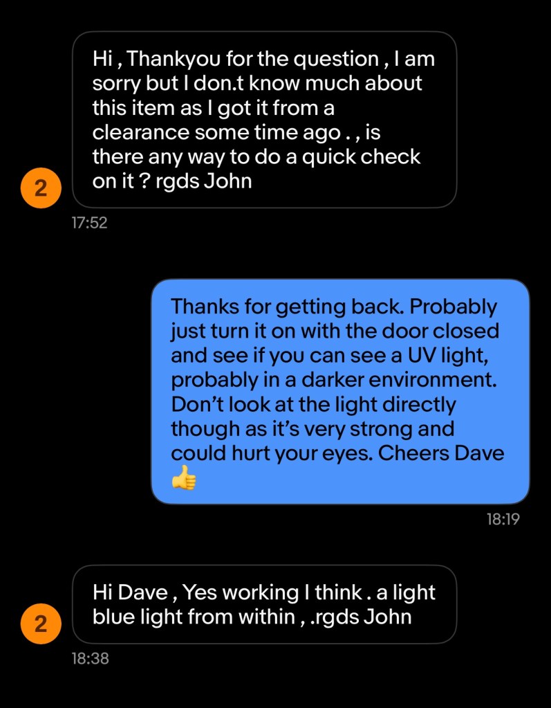 When I received John’s reply I jumped in with an offer and this was accepted. He had been so helpful. I’m now awaiting the unit, but I’m now a lot more confident that the unit, and most importantly the UV light is currently operational. However it’s probably going to be subjected to some pretty rough conditions on its delivery journey, so I’ll keep my fingers crossed for now.