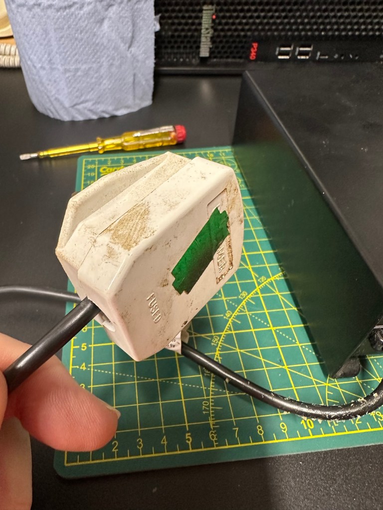 Before I do go inside I have first checked the plug, it currently is carrying a 13amp fuse that is way to large for this unit. It only requires a 3amp fuse so I have replaced this. I haven’t used the Pat tester yet I’m just using the multimeter, and I’m a bit concerned as there is no continuity between the earth pin and the unit case. Time to get inside.