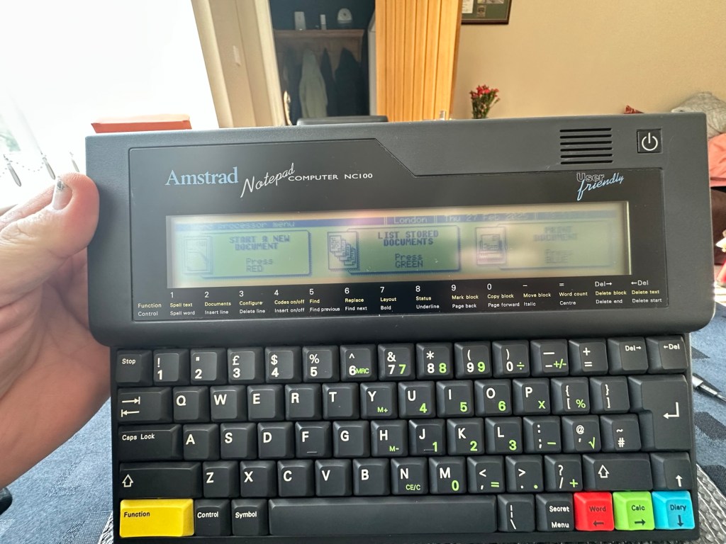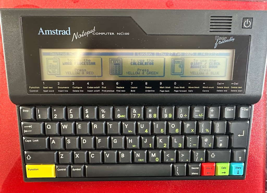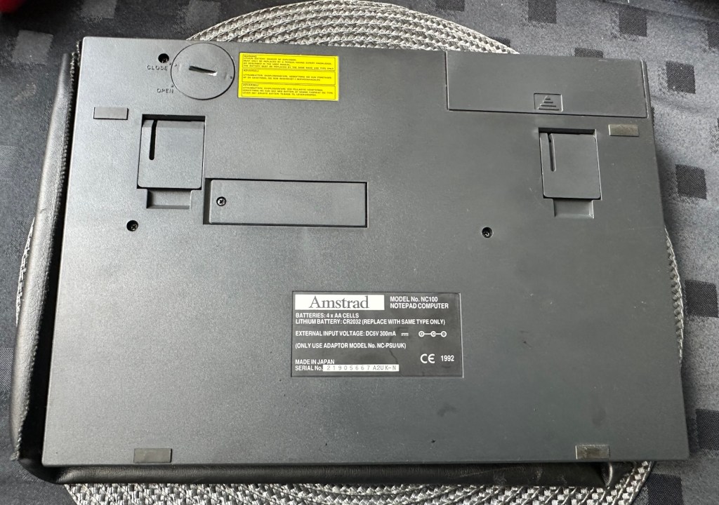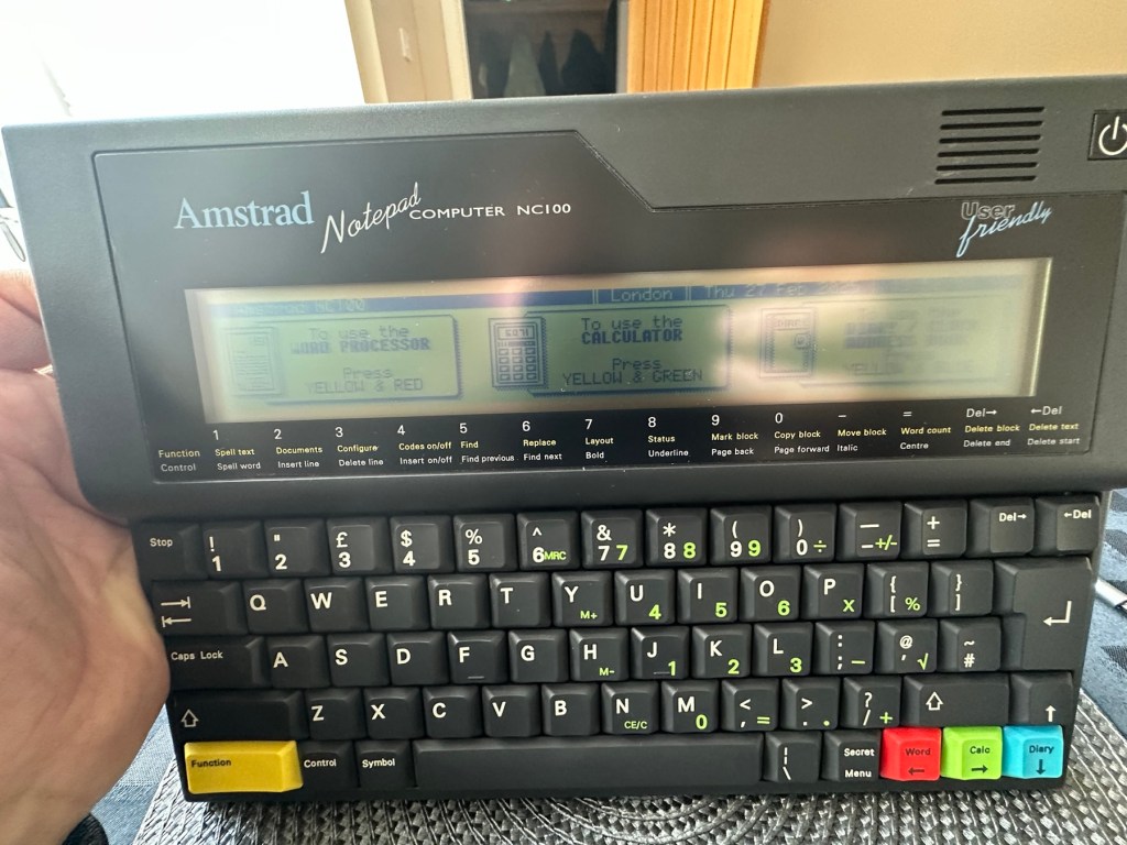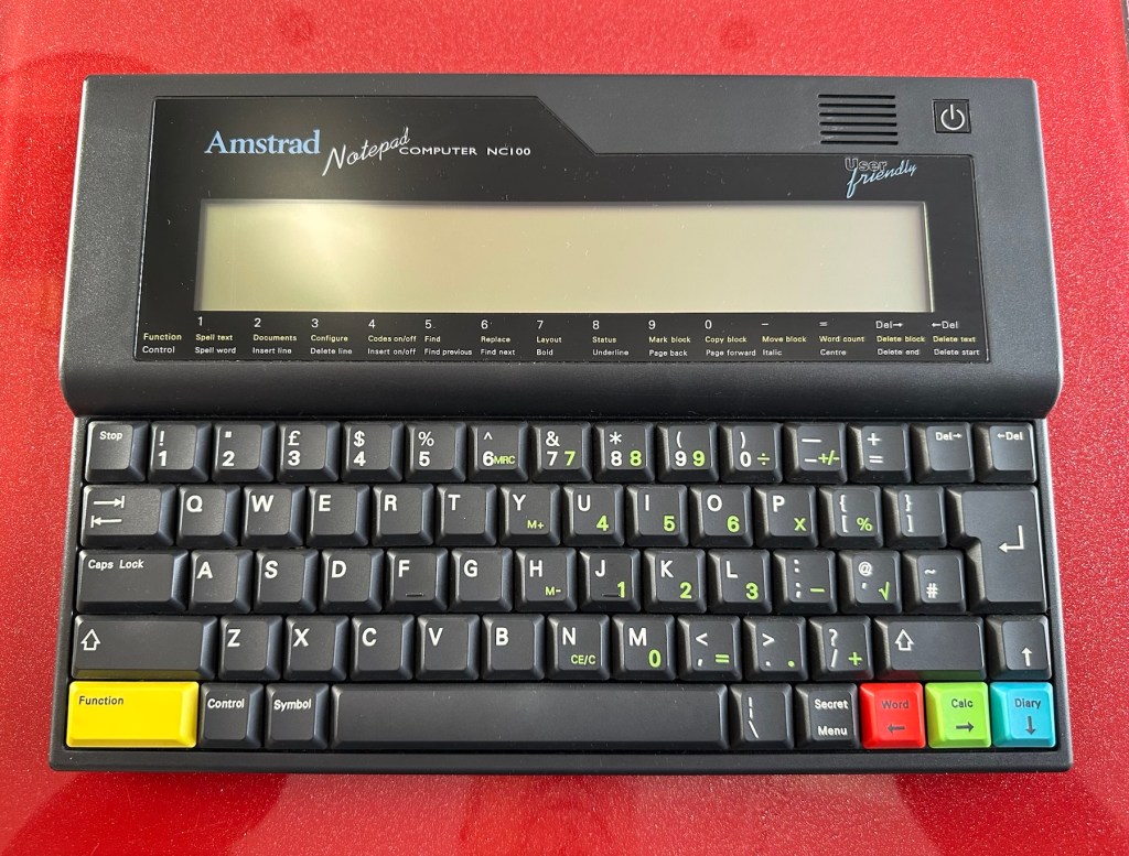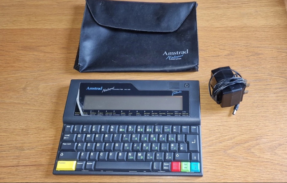 The Amstrad NC100 Notepad is an A4-size, portable Z80-based notebook computer, released by Amstrad in July 1992. It featured 64 KB of RAM, 256KB of Rom, the Protextword processor, various organiser-like facilities (diary, address book and time manager), a simple calculator, and a version of the BBC BASIC interpreter. The computer’s design, evocative of the TRS-80 Model 100, features a screen with 80 character columns by eight rows, and not backlit, but this let the NC100 run for up to 20 hours on four standard AA cellbatteries. There was an RS-232serial port, a parallel port for connecting a printer, and a PC card socket, by means of which the computer’s memory could be expanded up to 1 MB.