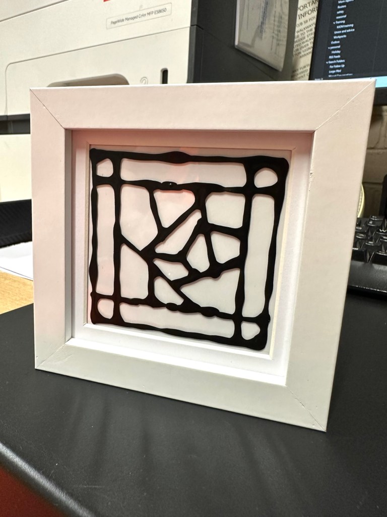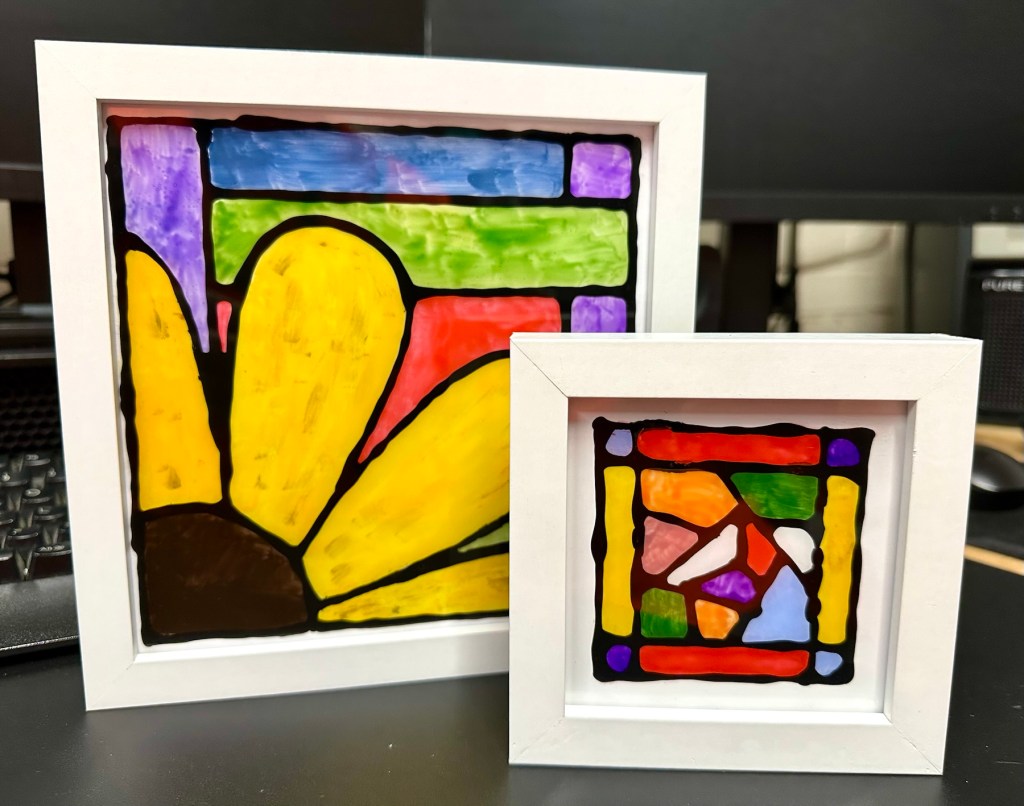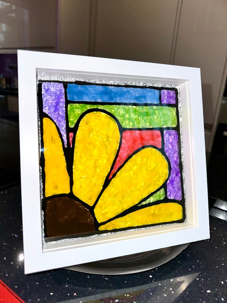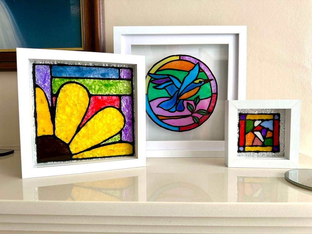 I’m quite happy with my first attempts, there are little mistakes and many things I have learned from trying this medium. I’m not going to make any changes to what I have done as I want to display them as battle scars. You know, a snapshot of what I did at the time and how I have learned from it. The next examples will be better, I have a third one of these box frames and that will incorporate all I have learned from doing these little prints. It will be just like a journey into Faux stained glass in three parts, and they will all be on display.
