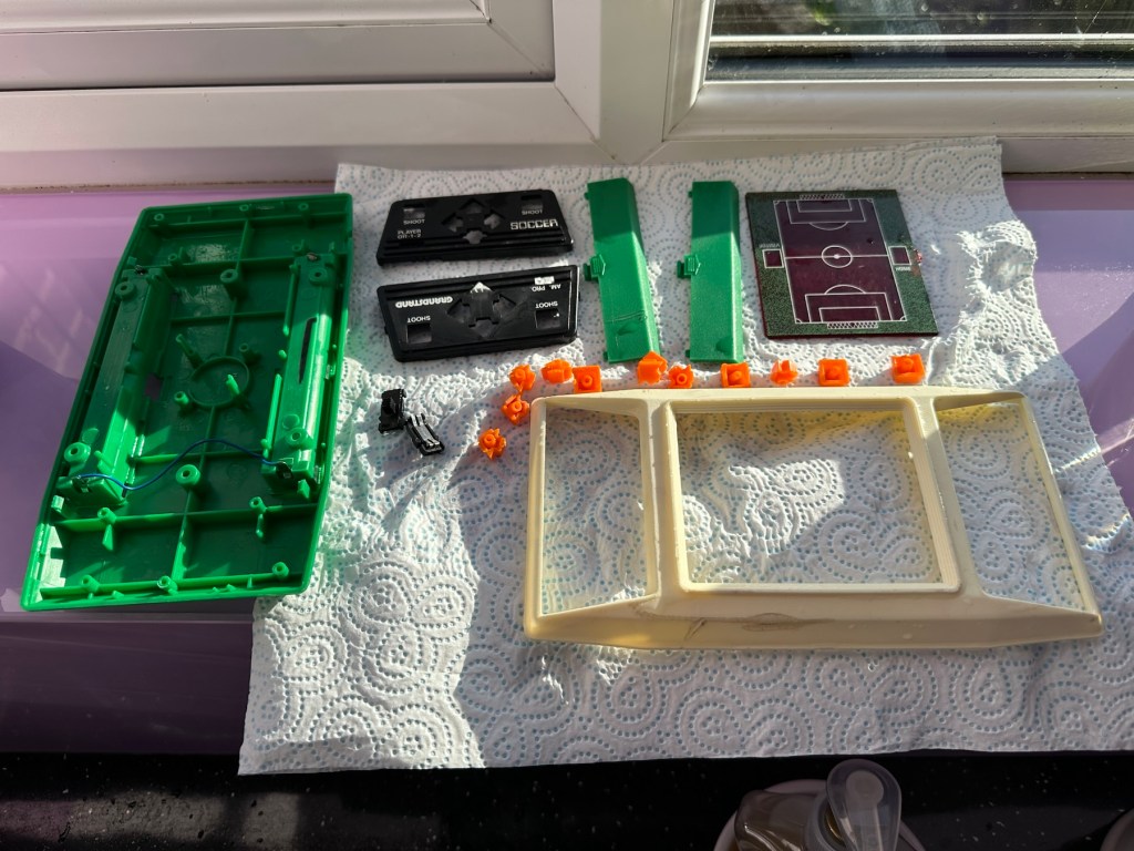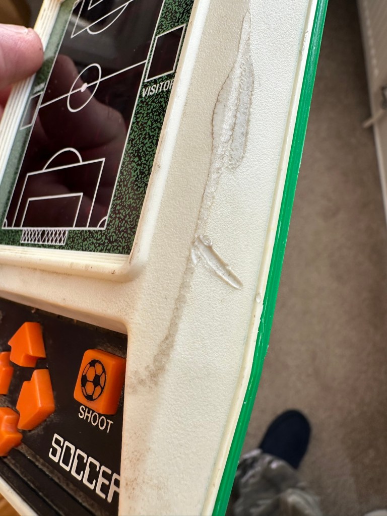 This guy sells retro games on EBay at exceptionally inflated, ridiculous prices. I suspect he doesn’t get involved with repair or renovation as he had this one advertised at over £30GBP but when I put in a cheeky bid for £12GBP he bit my hand off… I wasn’t expecting that! The usual mistakes in the listing such as stating it’s 56 years old when its actually 46, and stating it’s Very rare – it’s not, there were a few hundred thousand churned out and to be honest and they come up quite often on the sale sites. But I do agree it’s worth restoring and will pair up nicely with another retro football game from 1979 that i repaired a few months ago Bambino kick the goal football game. And what makes this unit even more appealing is that it is complete with both of its battery covers – now that is rare!