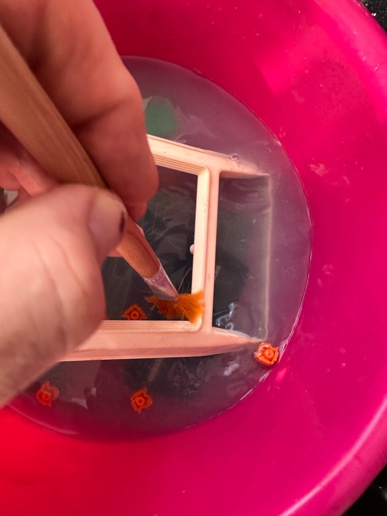 Here I’m painting, probably a little to thickly, and I’d probably be better with some glass or enamel paint. Lesson learned.