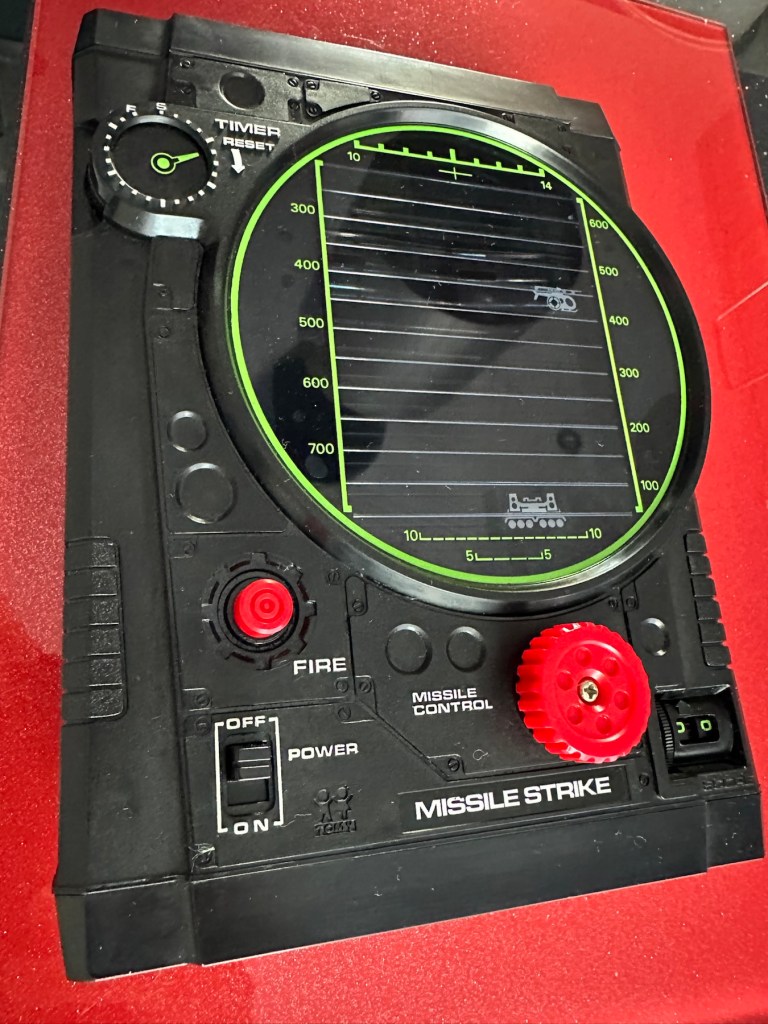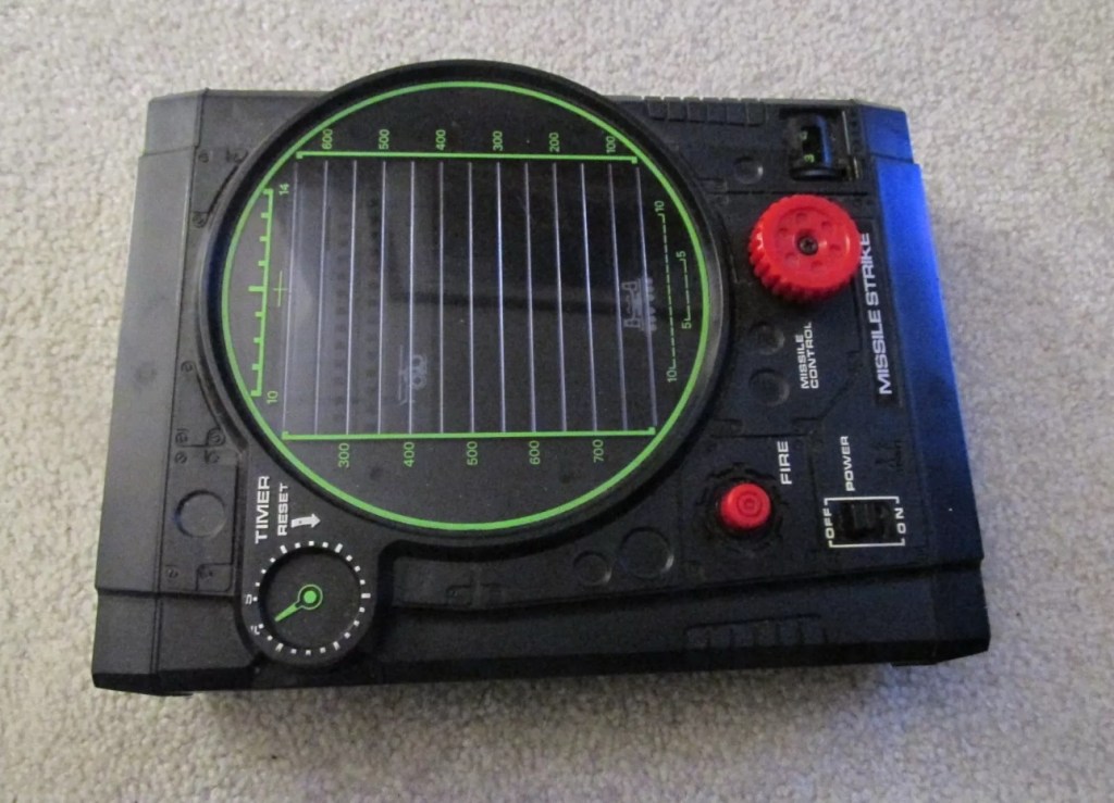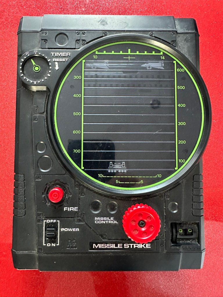 Tomy released Missile strike in 1979 in its international line of electro/mechanical handheld games. Known under different titles in other regions such as Terra-Hit (UK), Missile Strike (UK), and Space Attack (Japan). One of TOMY’s electro-mechanical handheld games, Missile strike is a Space Invaders-like shooter game, the units small motor winds strips of aircraft across the screen, which the player attempts to hit in order to earn points. There is a mechanical wind up timer that controls the action, and the purpose is to score as many hits on aircraft as possible with in the time it takes the winder to stop. The game includes one small, flashing LED light as the exploding missile.