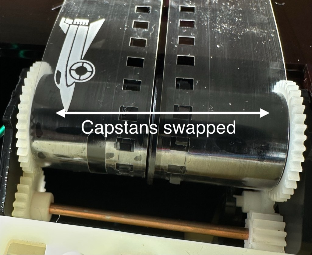 The issue with the film movement was a strange one. There was no way to tension the two capstans that the film roll over and there were no teeth missing off the capstans. One capstan pulls whilst the other pushes, all I’ve done is swap these around and the issue has disappeared. About as simple a fix as you can get.