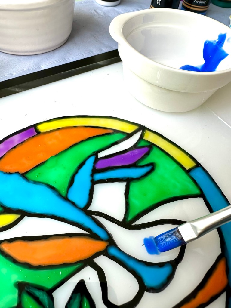 Using a steady hand you then just add the glue/paint to the top of the glass following the template underneath. Don’t worry too much if you get some blobs and bubbles, the bubbles can be burst by using a needle and the blobs can be dealt with when the solution dries, because the glue can be easily cut or peeled back. Don’t worry too much about little mistakes, just go with it. Don’t worry about making straight lines perfect as the irregularities just add to the authenticity of the piece. You don’t see perfect lines on old stained glass windows, so don’t worry. I use some small paper tortillons just to remove some small smudges and they work fine.