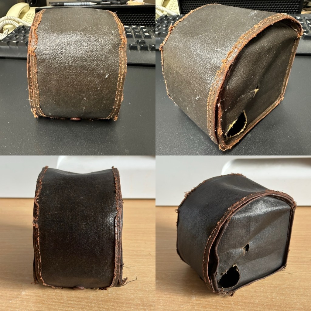 Using some mild detergent, but just the soap suds on a cotton pad I have gently wiped all over the case, paying special attention to any old folds in the material. This has had a dual purpose of removing ing a lot of age related dirt (As you can see in the photos above, that show the dirty cotton pads) as well as adding a little bit of moisture but not too much. I want to do this in stages to minimise any more damage. I will now let this dry for 24 hrs and I will then do the same again.