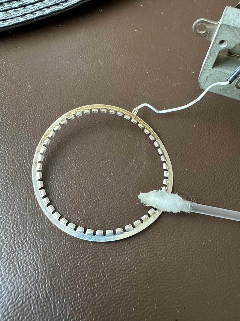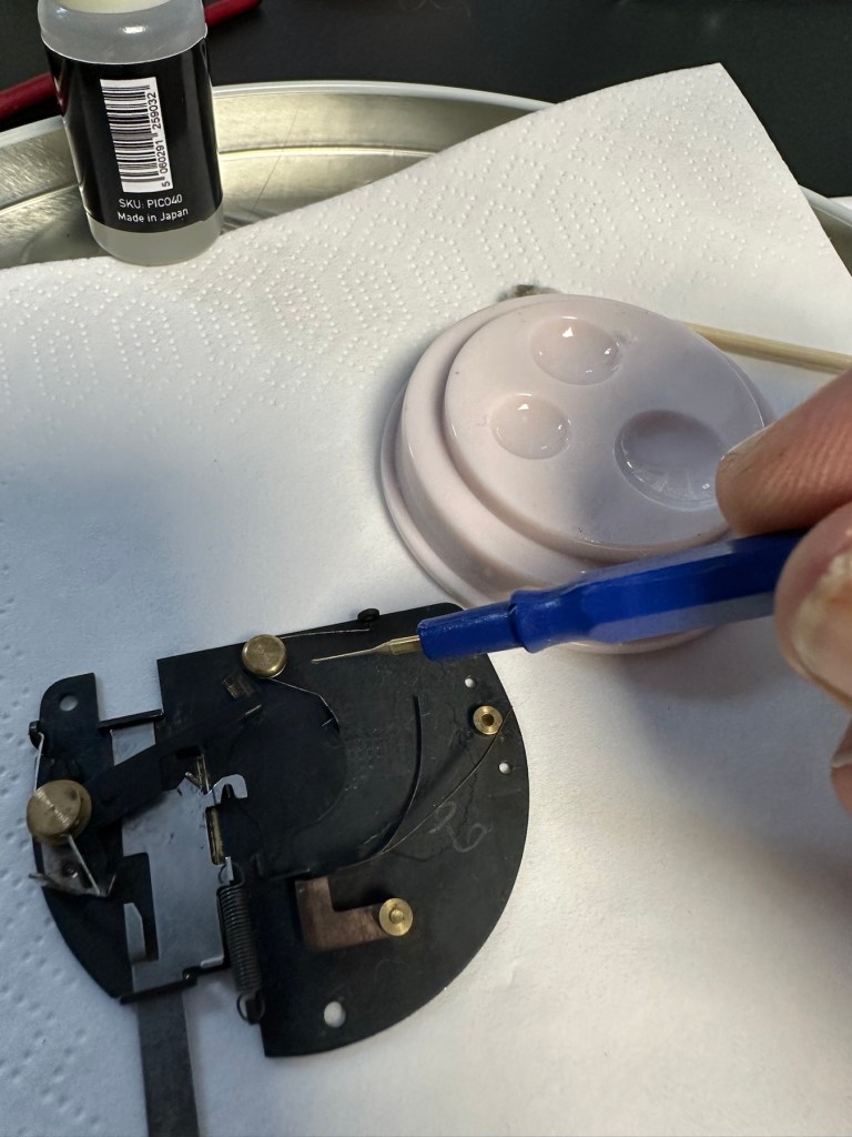 A The mechanism is beautifully simple and is such a lovely piece of work to look at. To think im probably the first person to look in here in the last 70 years is special. All I’m going to do here is very carefully get rid of as much old ingrained dirt as possible and very gently clean the shutter leaf. I will use a minuscule amount of clock oil on the mechanism only, I will use some fine graphite dust on the actual leaf part of the shutter.
