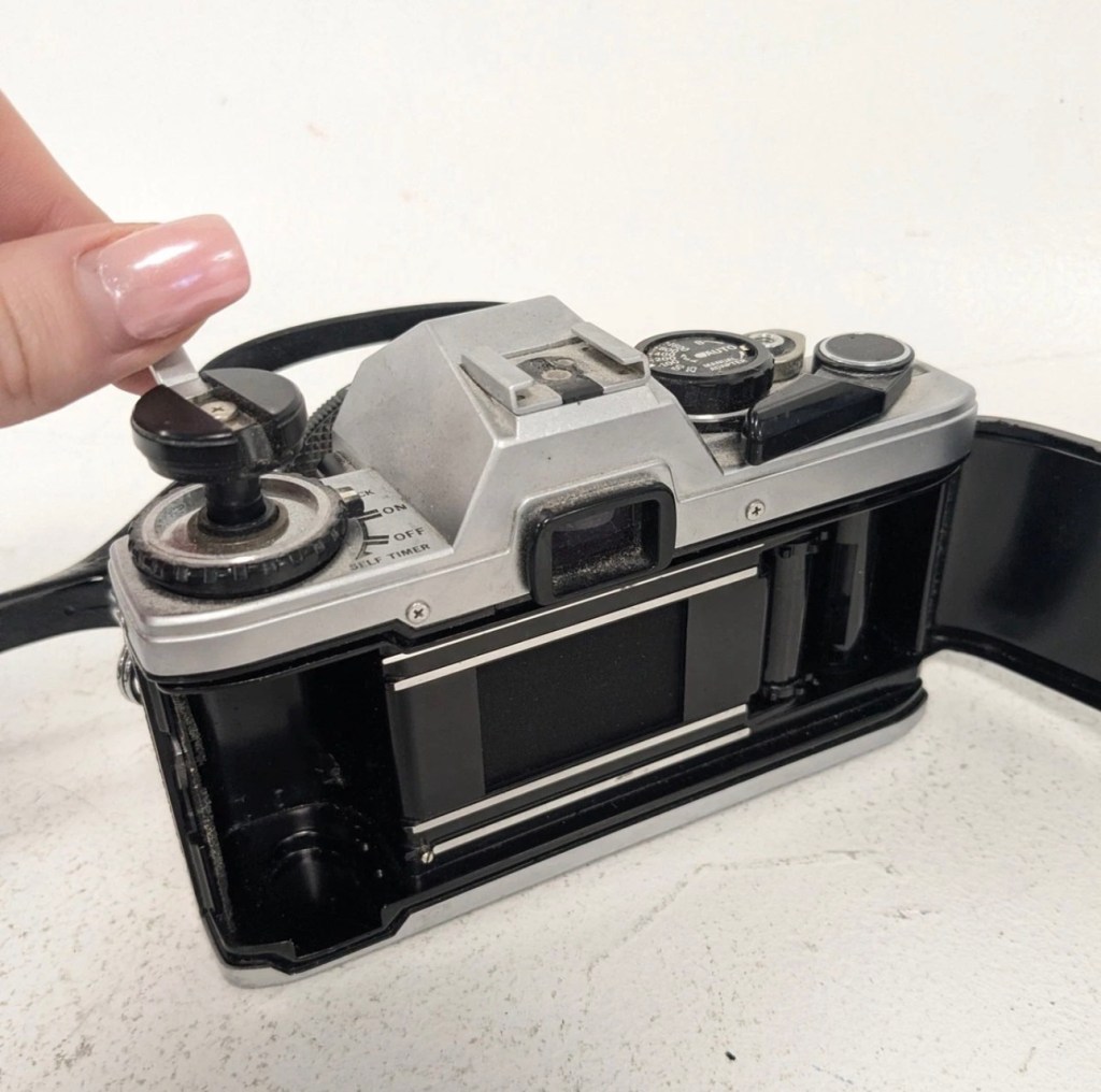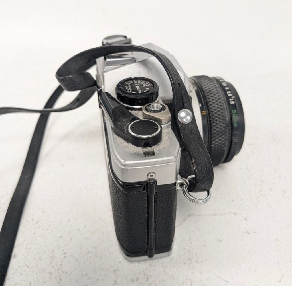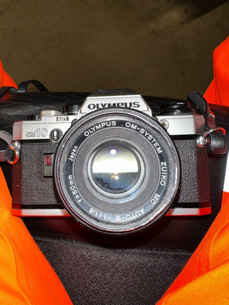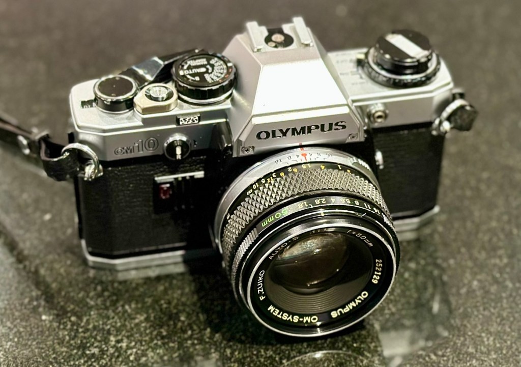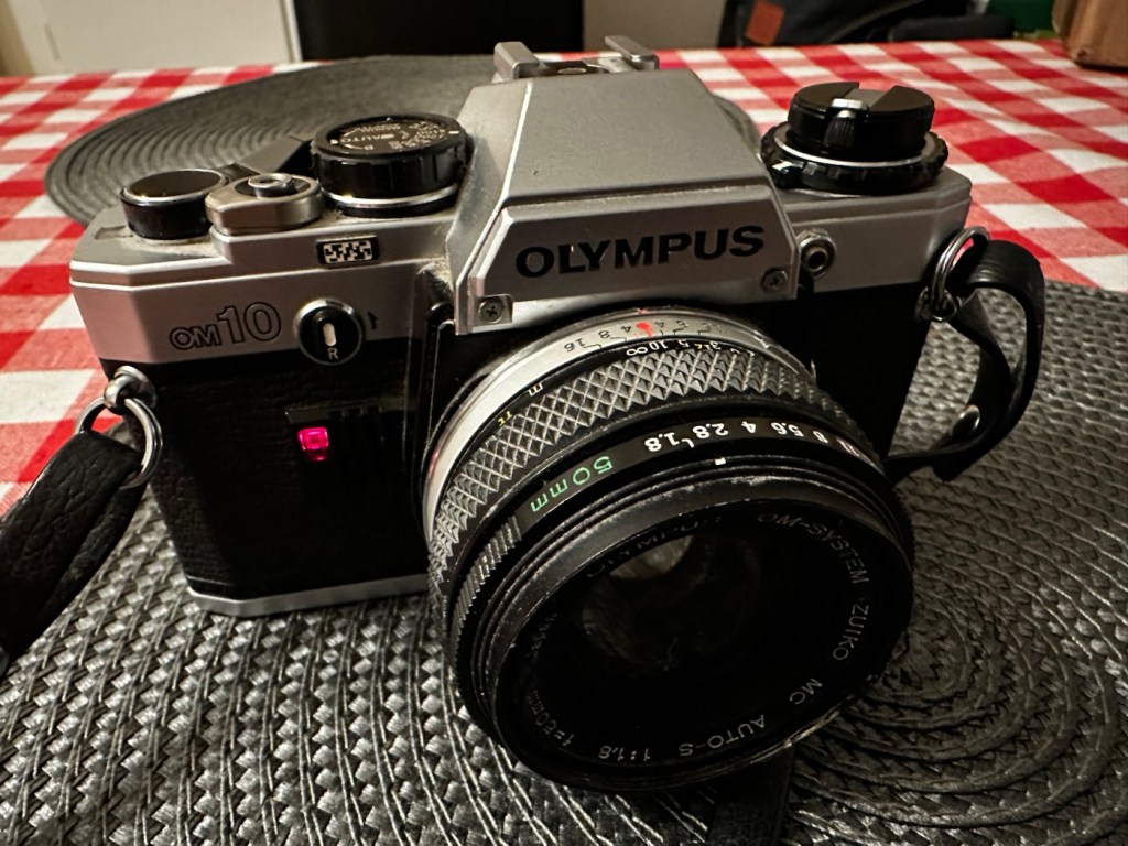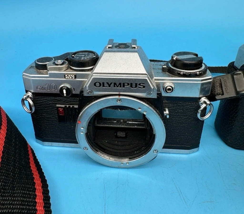 Here we present a fully cleaned and maintained Olympus OM10 35mm SLR camera from the 1980s looking quite resplendent after all the work on it has been completed.