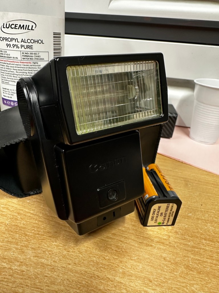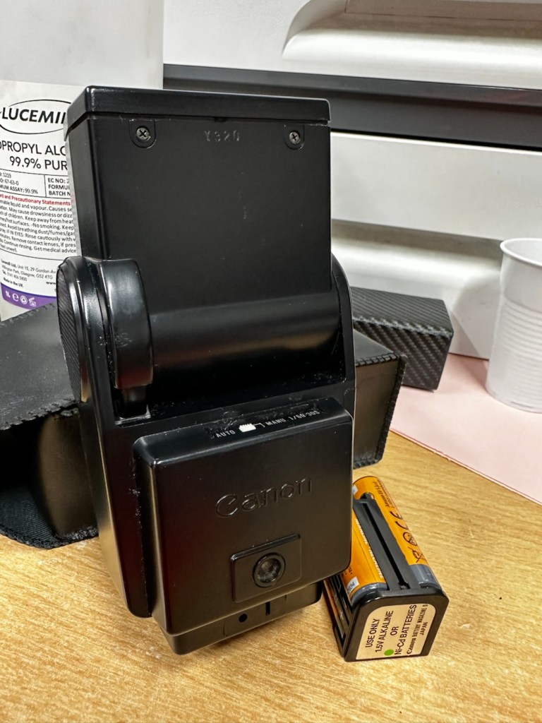 Production of this flash unit commenced in 1978 for use with the Canon “A” range of cameras that were being produced around this time. It can also be used with some other camera ranges. Before we get into exactly what is wrong with this specific unit, let’s look at some information regarding the spec of this flashgun: