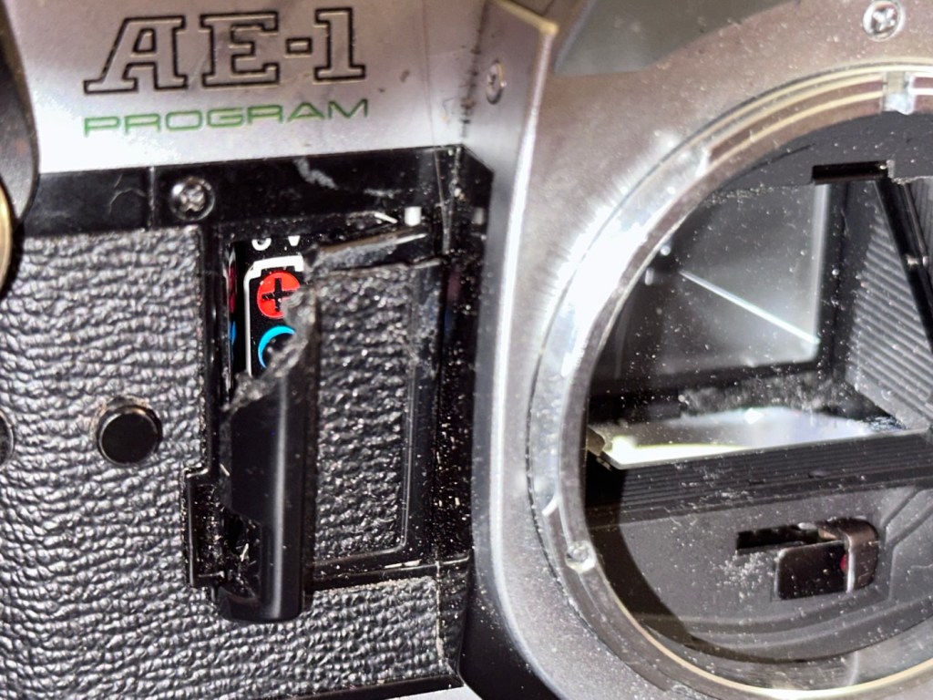 The mirror is stuck in the halfway position, this could be purely to do with there being no battery in the camera. It would be good to see with new batteries installed, if the mirror magnets would then kick in, and then they’d be no further issue. However, knowing my luck they are probably inoperable as well, we will just have to wait. And for this same reason the winder is also stuck, again the batteries may well solve this problem 🤞