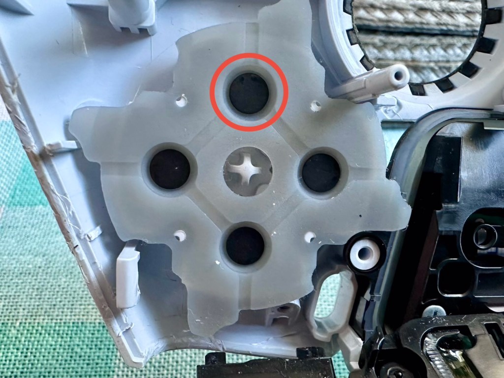 As soon as the top was removed I could see the potential issue with the controller direction pads. The pads are a rubber base with a carbon pad that makes contact with the circuit board below. Sometimes a simple clean of these pads can be sufficient to regain a connection between the two, but in this case it was plain to see that the pads on both sides were both well worn and to be honest they both required replacement.