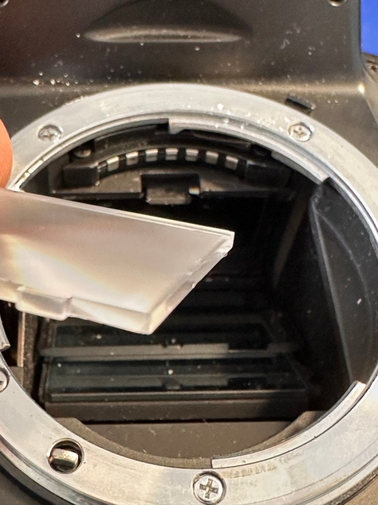 The old seal peels out but leaves a sticky residue behind, this has to be removed with some IPA prior to cutting new foam to size and reinstalling. Whilst I was in the lens are I also removed the focussing screen to clean it and remove the old ingrained dust and dirt.