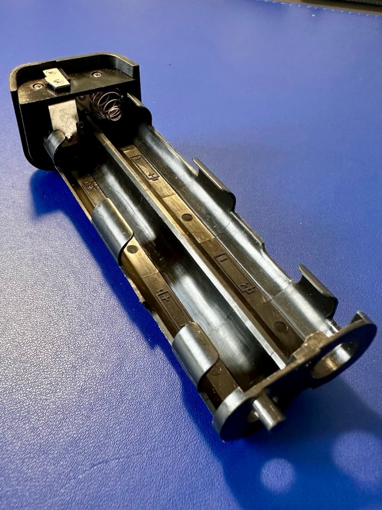 The mirror appears to be in a semi raised position, the battery pack is clean with no signs of contamination and battery leakage, so now seems a good time to put in four AA batteries and slide the battery pack into place and secure it.