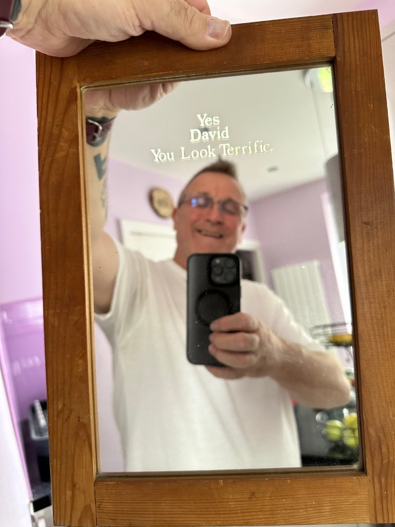 A cheap mirror it maybe. But it still makes me smile. The wife has now said it must stay and be prominent in the house.