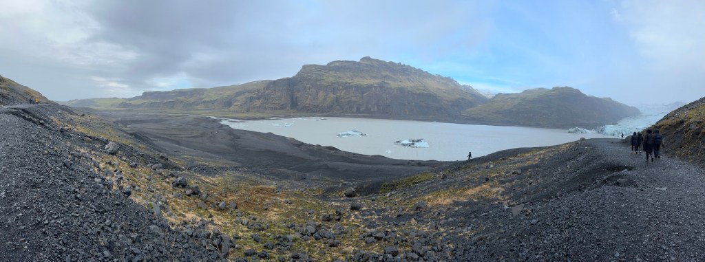 Panorama capturing the glacier decline. Only a few years ago this entire lake was solid glacial ice, now the only remaining glacier can be seen on the far right.