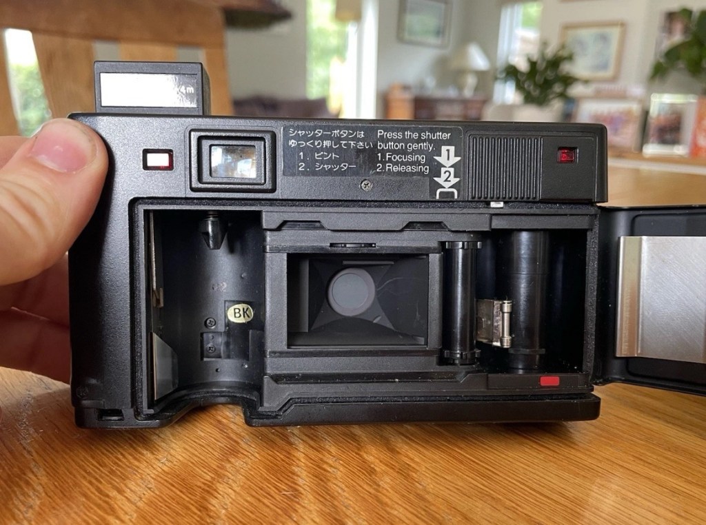 The actual camera is partially alive. When batteries are installed there is a red light that appears on the right rear side of the camera, this is the film transport light and should extinguish when transport is complete. The flash switch sticks a little, and when the flash is clicked into position the distance sensor light on the lens activates however the flash does not charge. The winding system is inoperative and does not auto wind at all. The shutter does not operate, despite the shutter leaves being able to move when gently coaxed.