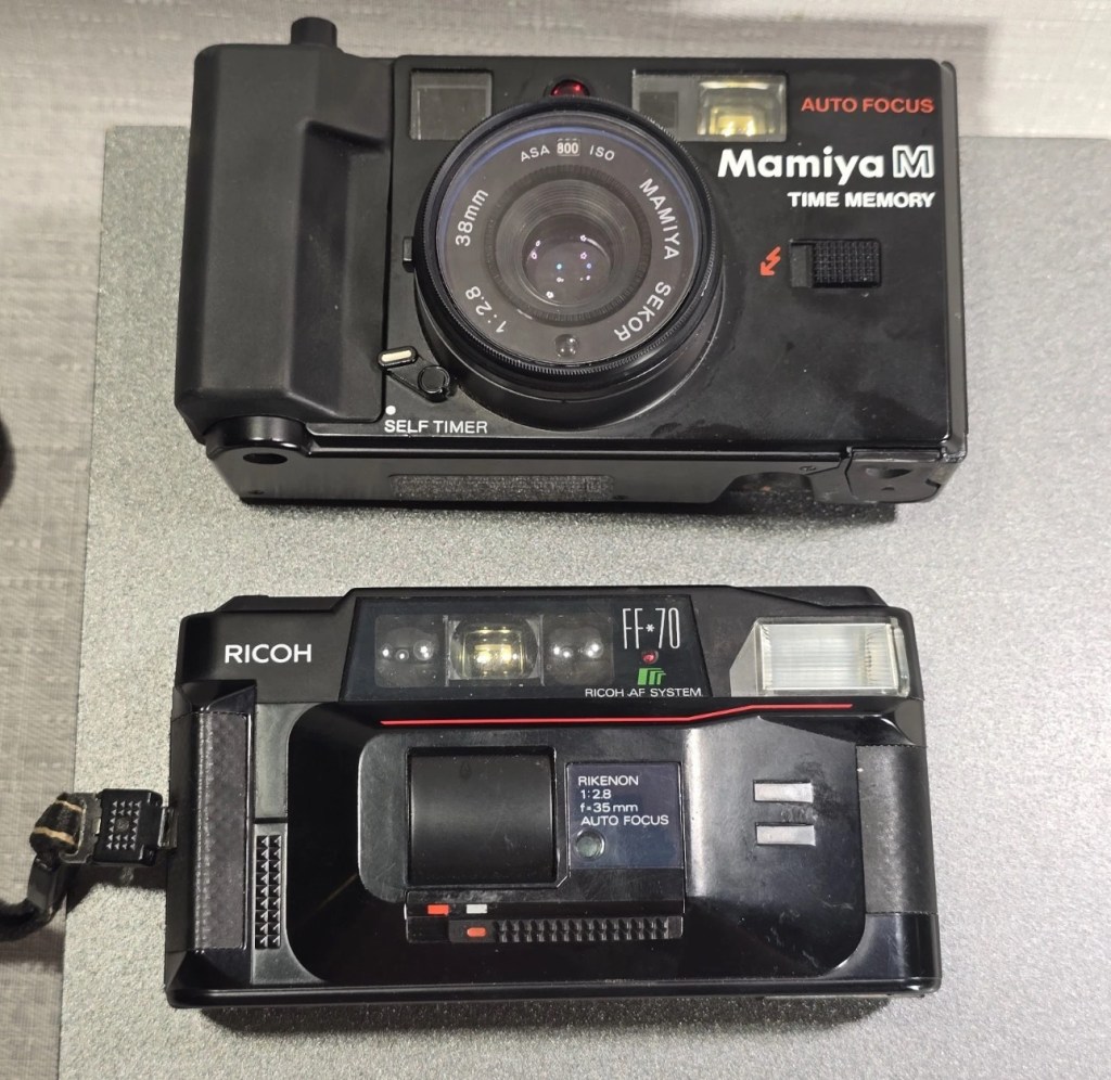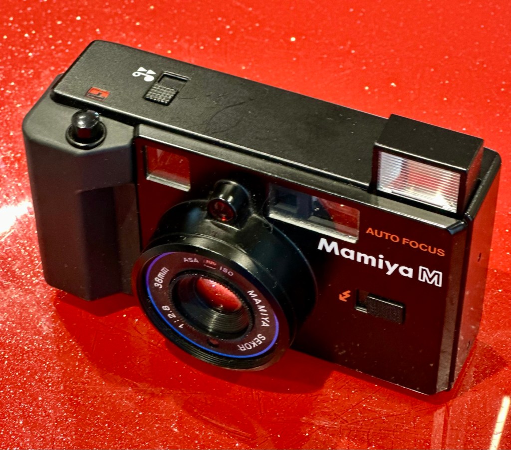 The Mamiya M is a 35mm autofocus compact from 1982. It has a boxy plastic shape, with a fixed Mamiya Sekor 38mm f/2.8 lens. The lens is four elements in three groups. Exposure is fully automatic, based on the film speed, where the ISO is selected via a dial around the lens. Film speed available is 25 – 800 ISO.