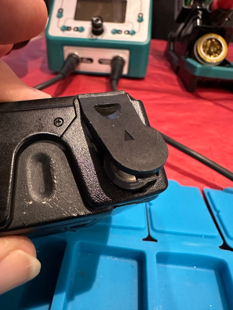 Once opened all looks ok so I decide to have a search around with the multimeter checking the basic operation. Am I getting 3 volts at the top of the battery barrel? No I’m not. It appears that one of the traces on the positive side of the power input board has lost continuity. For some reason the traces has been damaged, this could be either from corrosion or rubbing on something. The area affected is in the photo with the red ring around it.