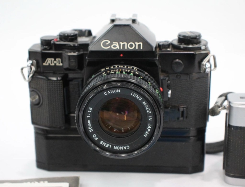 The A1 camera consists of the body, a winder, an FD 50 1:1.8 lens, a camera manual as well as a lens manual.