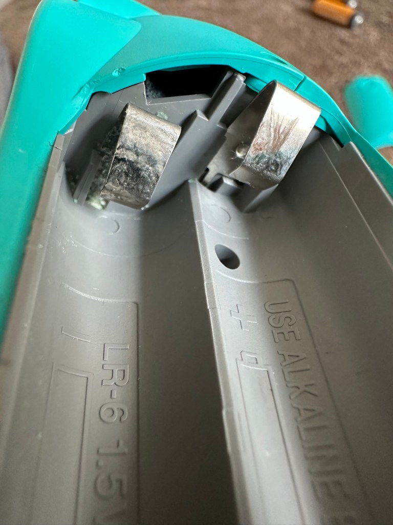 On opening. Oh my word. What the heck is that? I have never seen contamination around a battery terminal like that before, the battery contacts have been totally consumed.