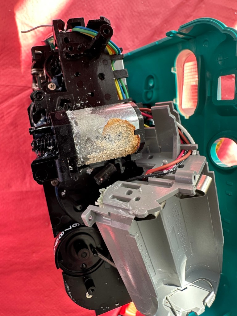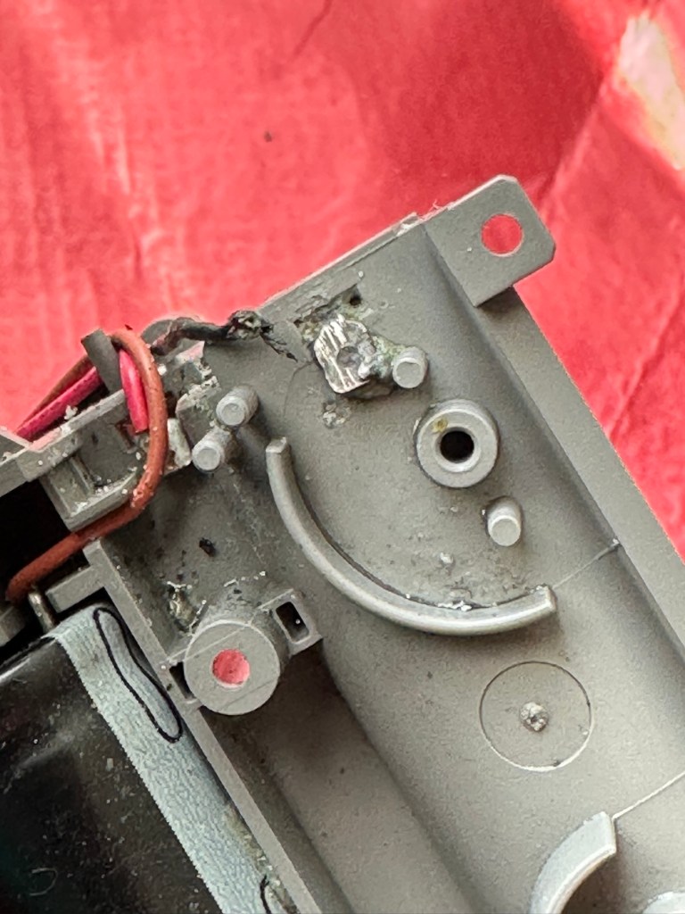 The good news is that there is no contamination on the battery contacts, they are absolutely fine. When batteries are inserted the transport runs, but it runs too long, and then a red light shows at the end of it’s movement, and no buttons work, in theory it’s dead at this point.