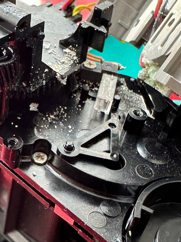 At this point the rear fascia and associated ribbon cable need to be removed to facilitate this repair. That’s when a piece of broken plastic falls out, it just so happens that one of the posts putting tension on the print rollers has broken. Great. Another problem. I’ve quickly fixed this by using some wire to act as a retention point. Bodge? Yes, but there really is nothing else that can be done here as the plastic case is thin and brittle. I have used some silicone grease to lubricate the cogs and the whole movement is now a lot smoother. It Will work. of that I am confident.