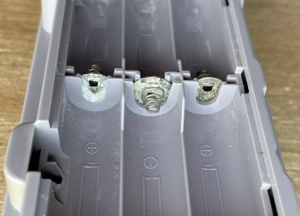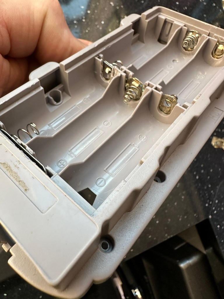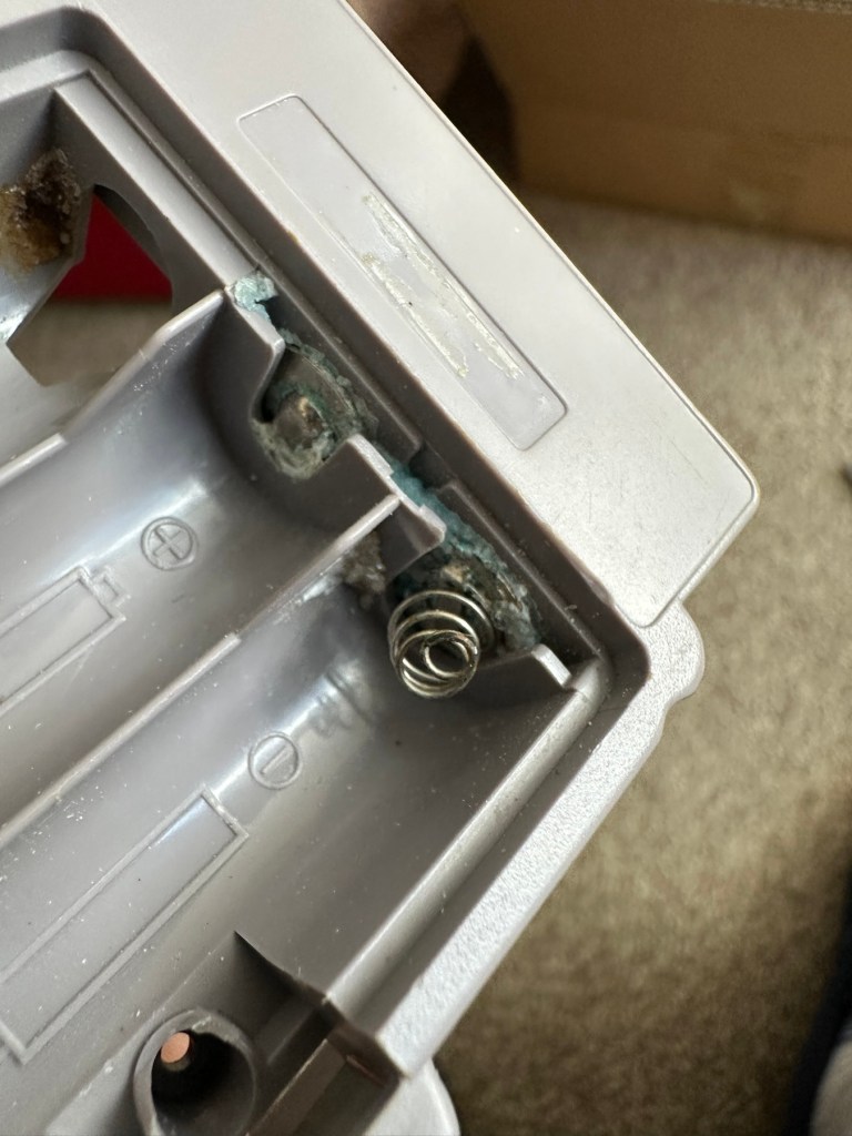 Well it certainly has the yellowing issues and I will cover that in a separate post where I will have my first attempt at Retrobrighting the unit. With batteries in place, the unit is very dead and no matter how many times the switch is operated, it remains dead. Battery terminals are a mess and there is a lot of evidence of battery leakage and corrosion.