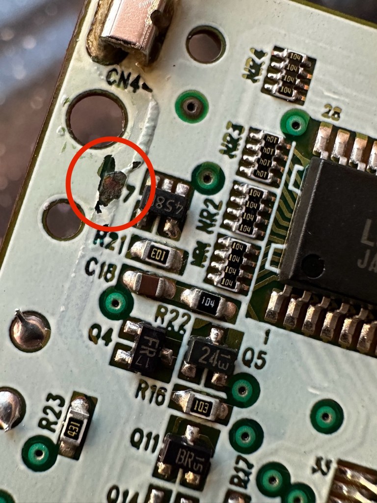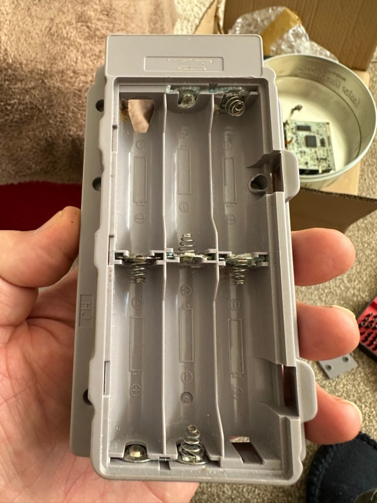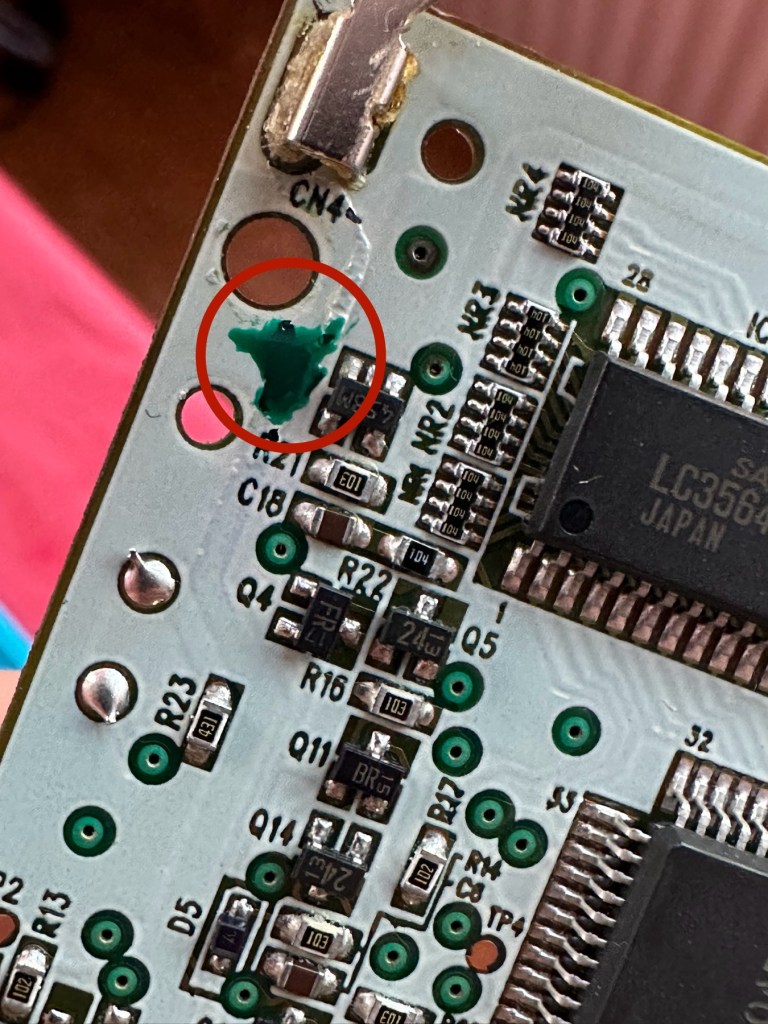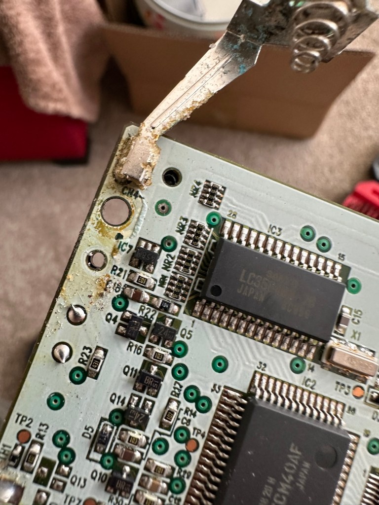 The board inside hasn’t been that badly affected by the corrosion, however one track from the battery terminal was showing signs of decay and will need attention. There are parts of the board that will need reflowing as there are some dodgy looking solder joints.