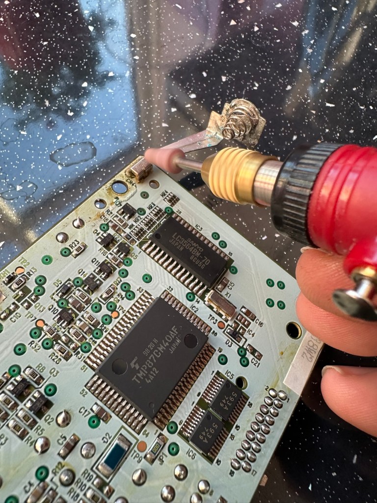 I had previously removed the motor from the board to assist with cleaning, as i didn’t wish to damage any of the ribbon cables. I then reconnected the cleaned and freshly repaired board, to the restored battery compartment to see if anything lit up. It sure did.